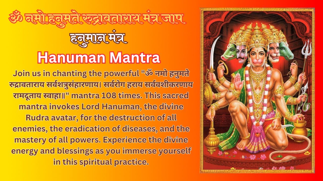 реР рдирдореЛ рд╣рдиреБрдорддреЗ рд░реБрджреНрд░рд╛рд╡рддрд╛рд░рд╛рдп рдордВрддреНрд░ рд╣рдиреБрдорд╛рди рдЬреА рдХреЛ рд╕рдорд░реНрдкрд┐рдд рдПрдХ рдЕрддреНрдпрдВрдд рдкреНрд░рднрд╛рд╡рд╢рд╛рд▓реА рдордВрддреНрд░ рд╣реИред рдпрд╣ рд╢рддреНрд░реБ рдмрд╛рдзрд╛ рджреВрд░ рдХрд░рдиреЗ, рд░реЛрдЧреЛрдВ рд╕реЗ рдореБрдХреНрддрд┐ рдФрд░ рдЖрддреНрдорд┐рдХ рд╢рдХреНрддрд┐ рдкреНрд░рд╛рдкреНрдд рдХрд░рдиреЗ рдореЗрдВ рд╕рд╣рд╛рдпрдХ рд╣реИред Om Namo Hanumate Rudravataraaya...